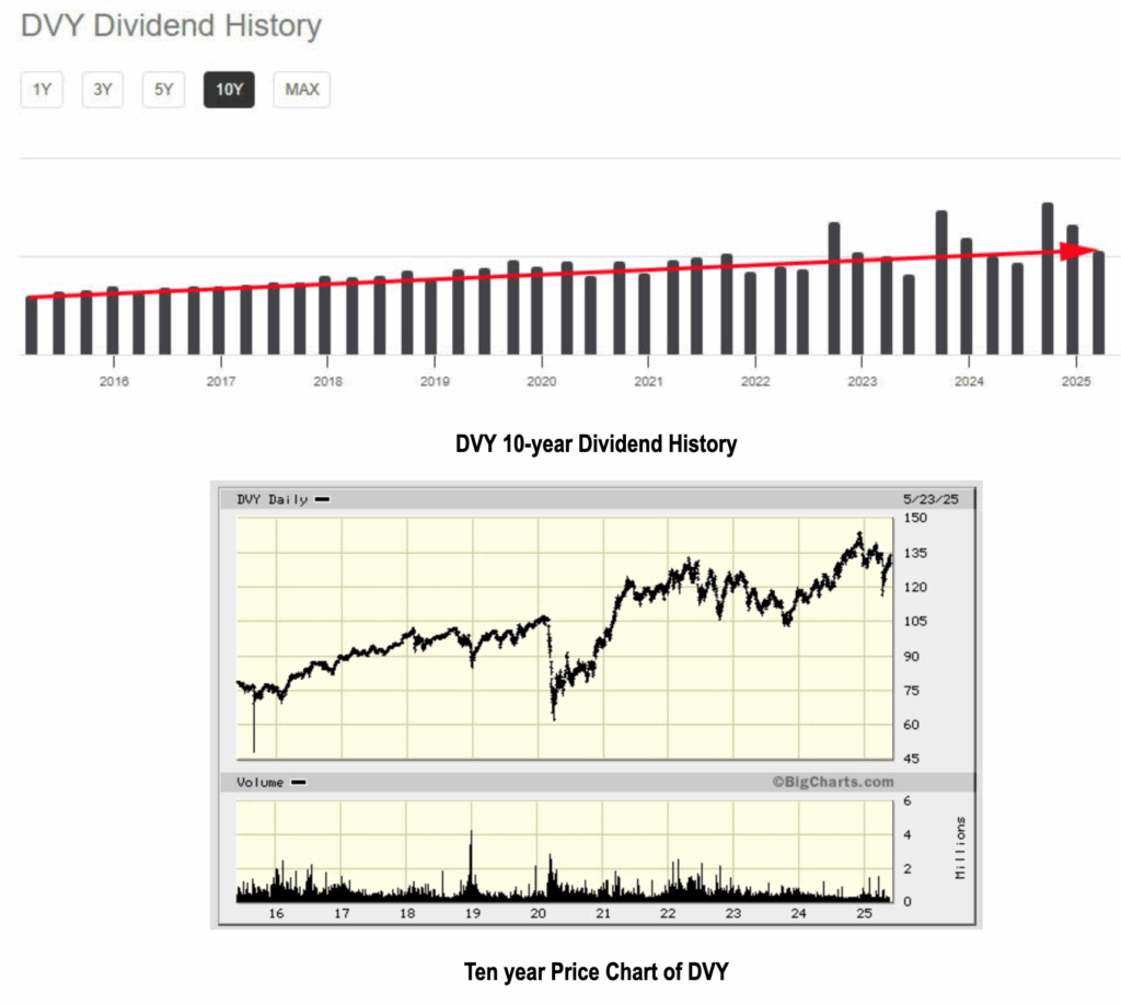 In this example your tax liability would be lower because the shares that you sell would be taxed at a more favorable capital gains rate. Plus, DVY has a good history of increasing in value as well as increasing its dividend.