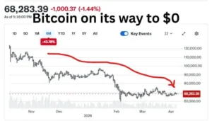 During October 2025, it reached its highest delusional price of $126,198.07 USD. Today, it sits at $68,038.19 USD: approximately a 46% drop in about six months. And this is just the beginning.