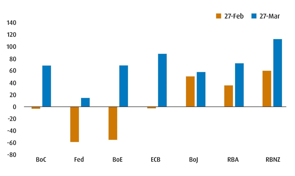 With that in mind, let’s consider the present environment. Even if the Middle East conflict is resolved quickly, the economic and market consequences will likely persist. Inflation risks are no longer symmetrically distributed, and price pressures appear likely to rise. Damage to energy-related infrastructure points to a prolonged period of crude oil and LNG supply disruption, pushing prices higher for longer. This affects refined products (such as gasoline, jet fuel, and kerosene), fertilizer production, and the supply of helium: complicating central bank messaging. Markets have responded by pricing out expected Federal Reserve rate cuts and pricing in aggressive hikes for other developed-market central banks (Chart 1).