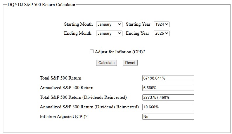Using a calculator, we can see that the S&P 500 returns for the last 100 years, including dividends, is 10.660%.